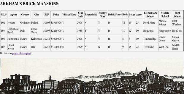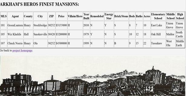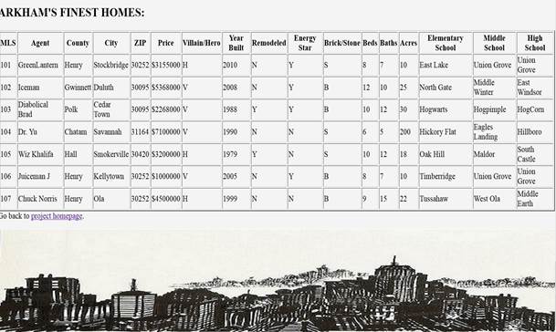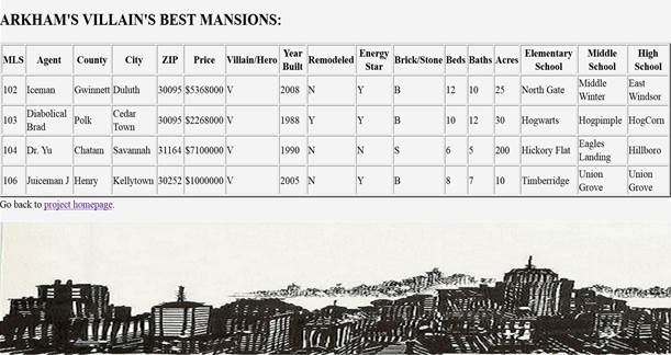 <th>City</th> <th>ZIP</th> <th>Price</th> <th>Villain/Hero</th>