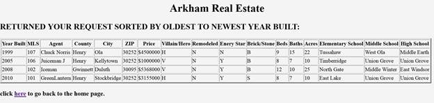 <h2>RETURNED YOUR REQUEST SORTED BY OLDEST TO NEWEST YEAR BUILT:</h2>